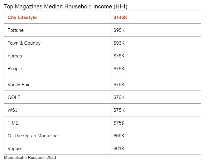At City Lifestyle, we’re proud to be at the forefront of this print renaissance. Our magazine not only ranks high in trust and aesthetic appeal but also reaches a highly desirable audience. According to Mendelsohn Research 2023, City Lifestyle ranks impressively in reaching high-income earners, with an average household income of $145K. This places us ahead of renowned publications like Fortune, Town & Country, and Forbes.